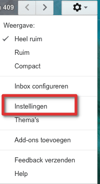 Zodra je ingelogd bent ga je naar het gereedschaps icoontje rechts bovenaan op de pagina, klik hierop en selecteer “Instellingen“. Er klapt zich in dit geval een menu / dropdown uit welke eruit ziet als in het plaatje hieronder.