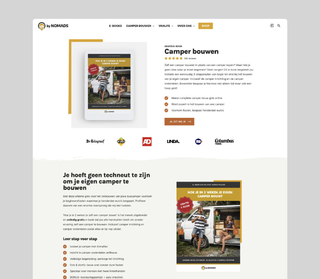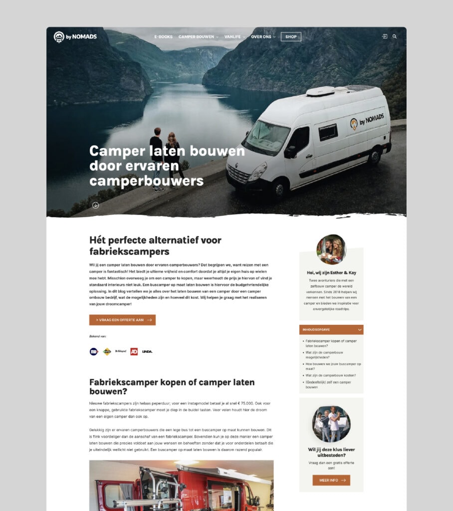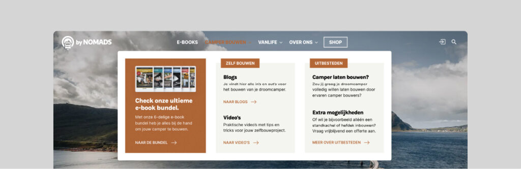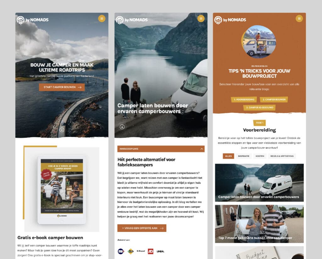 Er is veel content op de website te vinden, van bouw handleidingen tot rondreizen. Met behulp van een megamenu zijn de verschillende thema’s op een heldere en sprekende manier weergegeven. In het blogoverzicht van ‘camper bouwen’ zijn de artikelen opgedeeld in fasen van het bouwproces. Ook kun je deze verder filteren op thematiek. Om de tijd op de website te verlengen worden related posts weergegeven onderaan de blog. Deze related posts worden met een slim algoritme geselecteerd op relevantie.