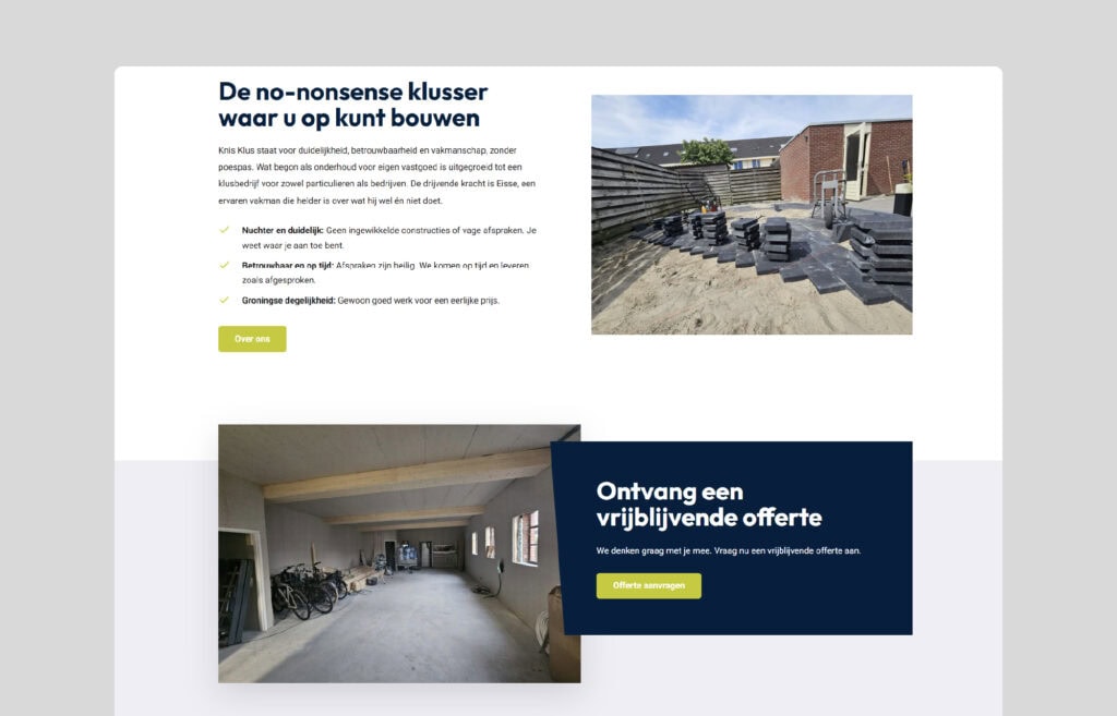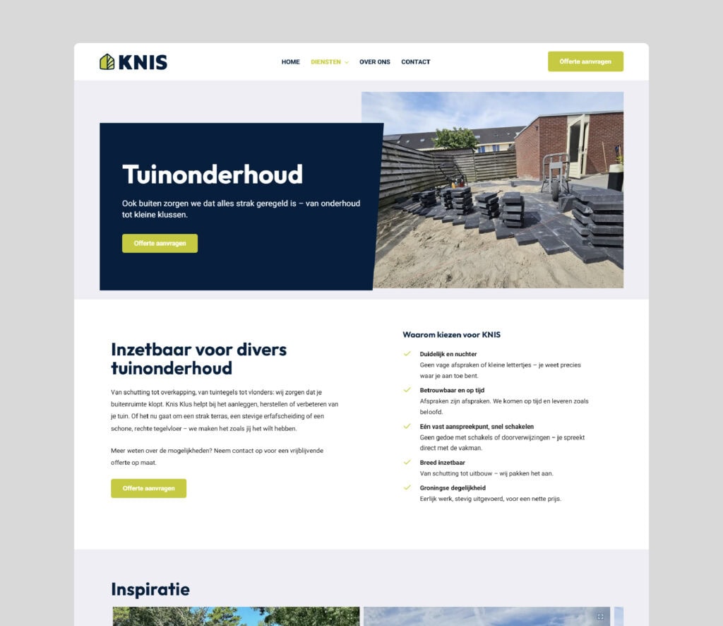 Bij Knis frissen ze je woning op, wanneer deze een opknap beurt nodig heeft. Wij hebben dat frisse idee gebruikt in het design van de site met bijpassende kleuren zoals crips green. Heel belangrijk is duidelijkheid over de diensten die worden aangeboden en een eerlijk verhaal met eigen foto’s zo is er een no-nonsense website.
