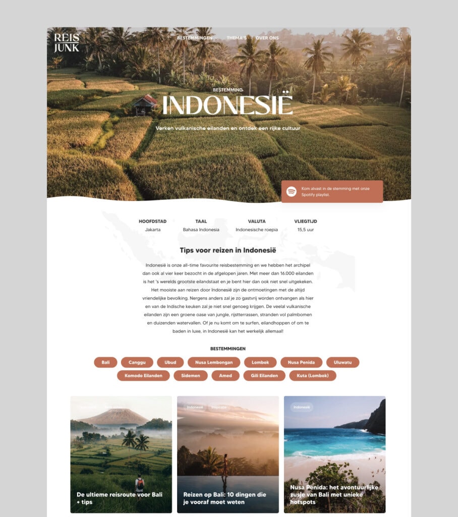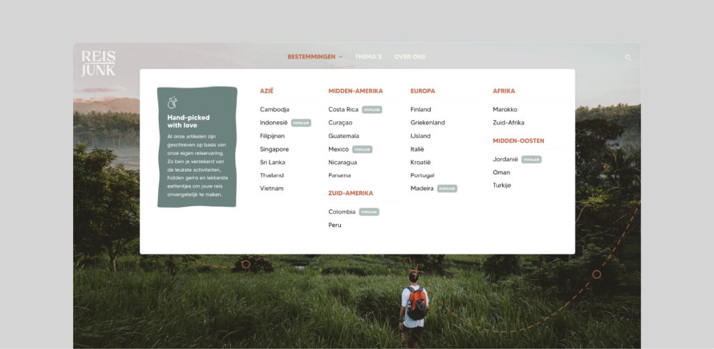 Reisjunk brengt je alvast in de stemming voor je volgende reis met ‘hand-picked’ tips voor bestemmingen over de hele wereld. Reisjunk schrijft artikelen vanuit eigen ervaring en die authenticiteit hebben we teruggebracht in het website ontwerp.