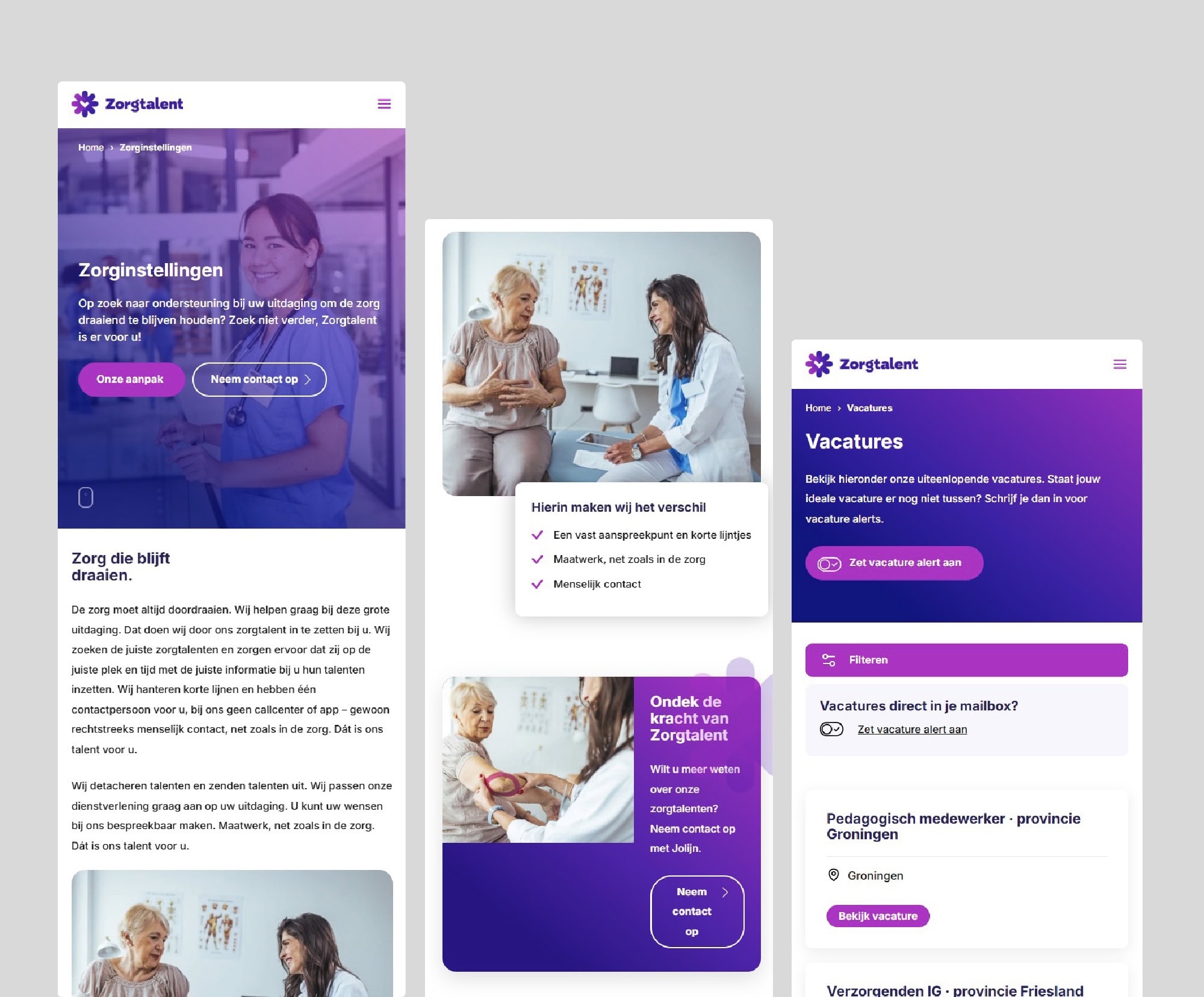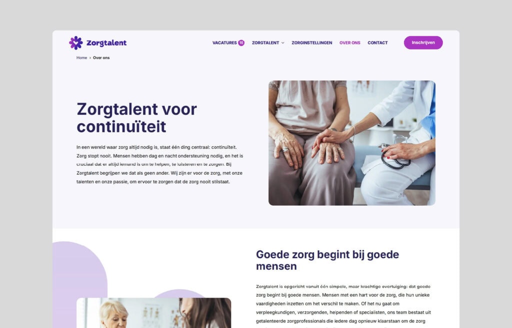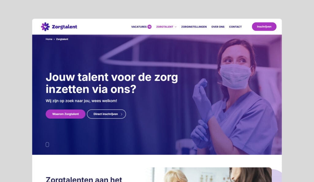 Zorgtalent biedt detachering aan voor zorgprofessionals. Zij geloven dat goede zorg begint bij goede mensen. Mensen met een hart voor de zorg, die hun unieke vaardigheden inzetten om het verschil te maken. Samen zijn we aan de slag gegaan met het ontwikkelen van een nieuw merk in combinatie met een website en vacaturebank.