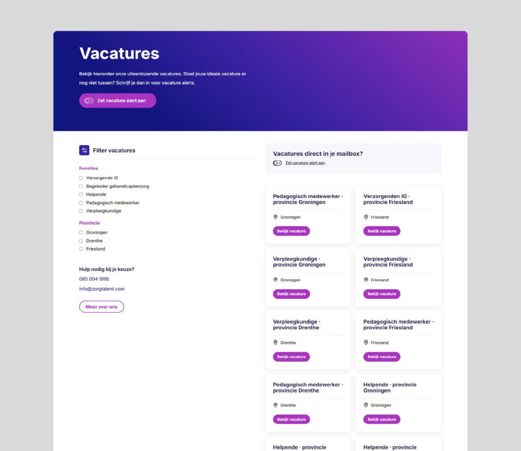 Mooie extra feature op deze website is de Vacature bank. Via een vacature integratie op de website bekijk je snel de vacatures per provincie of functie. Staat de ideale vacature er nog niet tussen? Dan is er zelfs een optie om je in te schijven voor een vacature alerts.